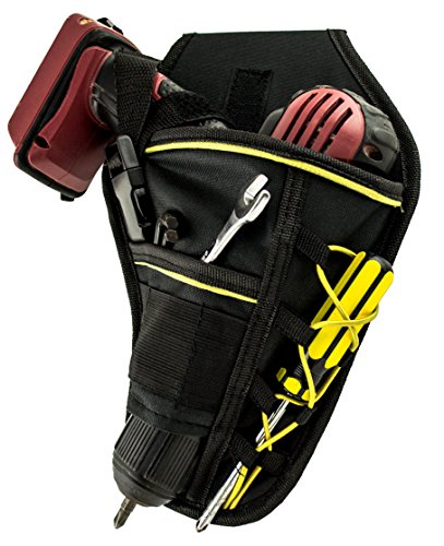 - GENERAL PURPOSE: This adjustable strap heavy duty drill holster, which has a quick release buckle, holds drill securely in place. This tough drill holster also has added pockets & elastic loops to hold bits, chuck key, drivers, etc.
